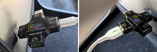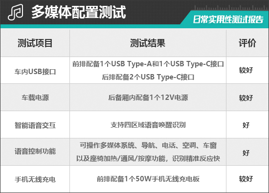 同时,我们对USB接口的电压、电流和功率进行了测试。前排USB Type-A接口充电功率2.36W,电压4.94V、电流0.47A;前排USB Type-C接口充电功率14.5W,电压9.13V、电流1.59A。由于评测车个体原因,位于后排的两个USB Type-C接口均掉落在饰板内,无法正常插入设备进行充电,所以未测得数据。