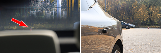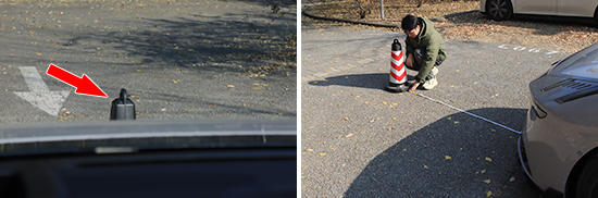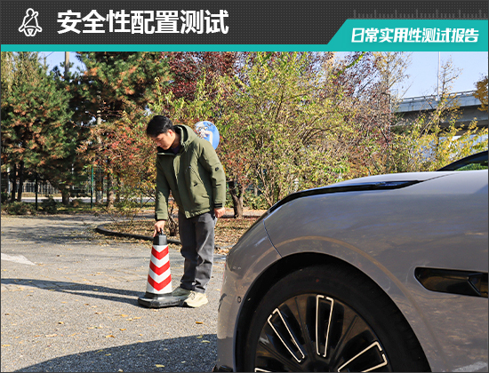 在前方视野测试中,我们采用高70cm的桩桶作为参照物,随后调整车距,直至在主驾驶位可以看到桩桶上沿。经过测试,桩桶与车头最终测得的数据为1.825m,在测试过的同级别车型中处于上游水平。