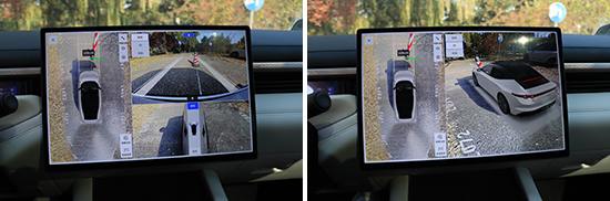 评测车配备360度全景影像,带有车侧盲区影像,配合透明底盘/540度影像,画面清晰度表现十分出色,畸变控制也比较得当。影像画面内带有可随动转向的倒车辅助线以及距离提示,能够为驾驶员提供有效参考。