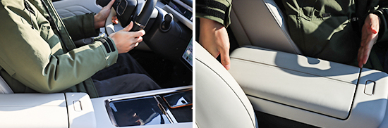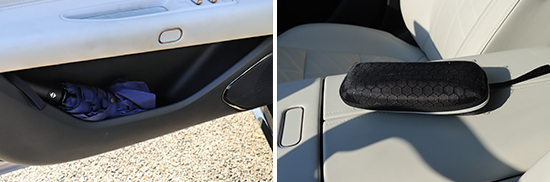 对于车内使用空间的测试,只针对前排触手可及的空间,不包括手套箱、中央扶手箱等需开启的空间。测试方法是将以下固定物品全部放置在前排的各个储物空间内,通过固定物品的放置情况来判断车辆储物空间的表现。测试选定的固定物品为:2瓶常规大小的矿泉水、1部大屏手机、1支口红、1个挎包、1副墨镜、1把折叠雨伞以及1包常规尺寸的抽纸。