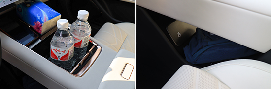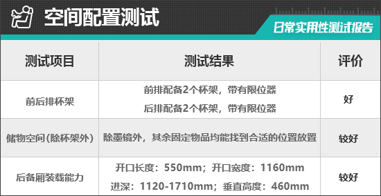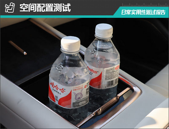 经过实测,评测车的储物数量较多,除墨镜外,其余固定物品均能找到合适的位置放置,整体表现不错。此外,评测车的前排和后排共计提供4个杯架,均配备限位器。