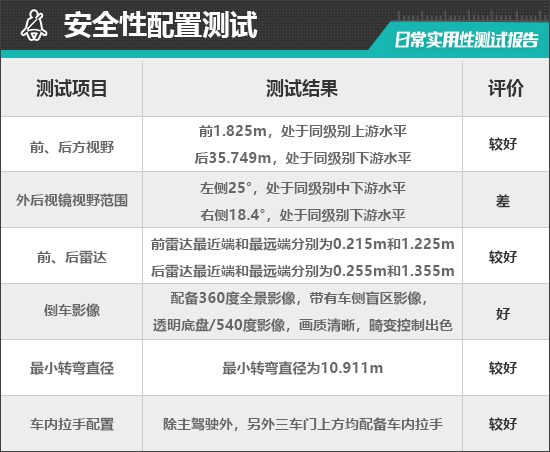 在车辆前、后方视野测试中,车内所有座椅均已调整至最低状态,所测出的数据与驾驶者正常使用时均有一些偏差,仅供参考。