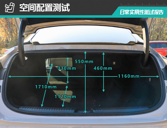 后备厢内部造型较为规整,地板平整度也相当不错。后排座椅支持比例放倒,放倒后可以进一步拓展后备厢空间。对于评测车后备厢的基础数值,我们也进行了实测,开口长度为550mm;开口宽度为1160mm;后备厢进深为1120-1710mm;后备厢地台与顶部的垂直高度为460mm。