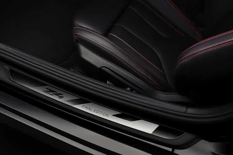 最后一批Z4 M40i Final Edition提供六速手动变速箱和八速自动变速箱两种选择,车内外均以黑色为主色调。外观车漆是个性化定制的磨砂黑,并标配一系列的高亮黑色组件,轮毂为前19寸后20寸的800M轮毂,搭配255/35 R19和285/30 R20轮胎,并配以红色卡钳。