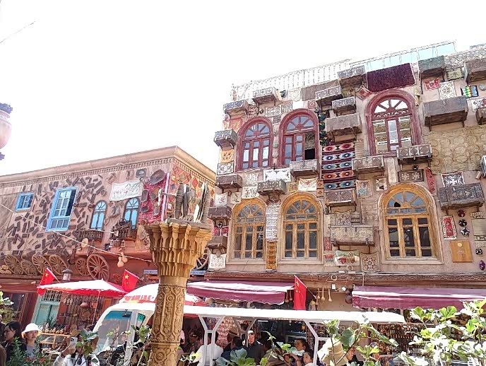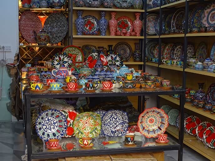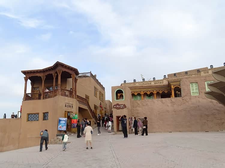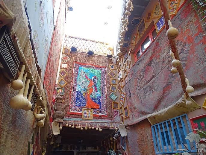 继续前行,转入艾格孜艾日克路,这条被誉为“风情胡同”的街巷果然名不虚传。两侧的店铺装饰得极具特色,有的门口挂着色彩鲜艳的挂毯、手工编织的地毯,窗台上摆放着造型别致的陶罐、木雕,还有的门口摆满各种充满民族风情的饰品,让人目不暇接。店铺内,店主们正专注地制作着手工制品,有的在打磨铜器,有的在编织手链。游人们纷纷举起相机,记录下这美好的瞬间,生怕错过任何一处风景。我们穿梭在各个店铺之间,在旧事杂货店中翻找着承载着古城记忆的老物件,在旅游品销售店中挑选着独具特色的纪念品,每一件商品都充满了故事感,让人爱不释手。