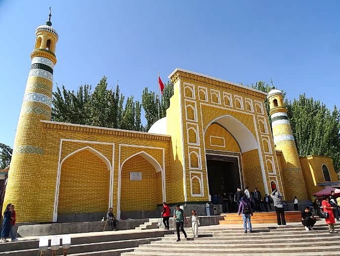 沿着吾斯塘博依千年古街继续前行,这条古街作为喀什古城的核心街道之一,承载着千年的历史与文化。不知不觉中,我们来到了解放北路,这条宽阔的大街是喀什市的主干道之一,也是连接古城与外界的重要通道。艾提尕尔清真寺和喀什艾提尕广场就坐落于大街旁,艾提尕尔清真寺作为新疆最大的清真寺,建筑宏伟壮观,极具民族特色。
