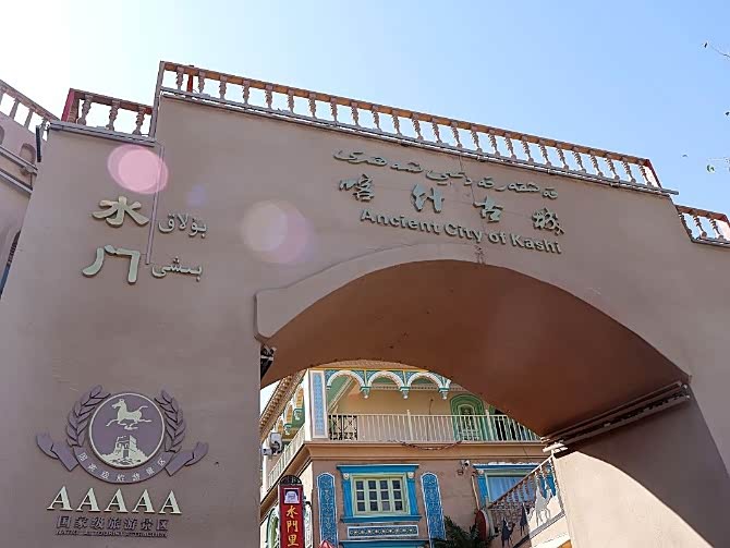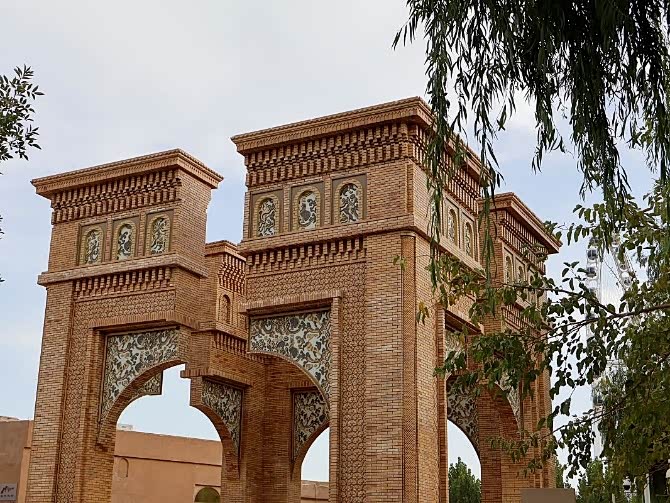 随后,我们沿着古城边缘的奥然卡依巷前行。这条街巷紧邻古城外围,街边布满了各种美食店和酒吧。美食店门口摆放着烤炉,烤羊肉串、烤馕坑肉的香气弥漫在空气中,让人忍不住驻足;酒吧内则播放着舒缓的音乐,游客们在里面悠闲地品酒、聊天,享受着惬意的时光。我们一边欣赏着街边的风景,一边感受着这份独特的氛围,偶尔走进一家小店,品尝一杯当地的特色饮品,十分惬意。来到古城东大门,我们登上了城楼。站在城楼上远眺,喀什古城的全貌尽收眼底。