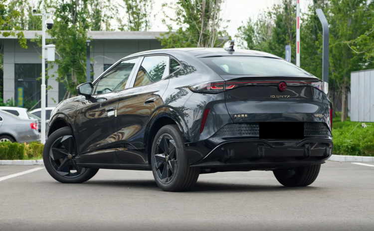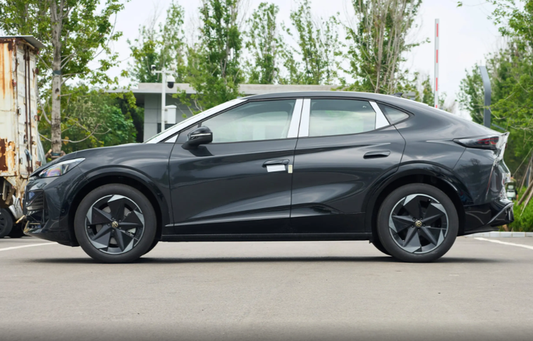 车身侧面造型同样让人眼前一亮,与当前新能源流行的设计手法完全不同,加入大量棱角分明的装饰元素,熏黑A柱的加入营造出悬浮式车顶的视觉效果,无形中增添了几分灵动气息。车顶设计接近于Coupe造型,看起来确实很带感。笔直上腰线呈上扬态势,与整体设计风格相得益彰。半隐藏式门把手兼顾美观性和实用性,配备20寸轮毂,有需要的消费者还可以选装21寸轮毂,再次强化车身气场。