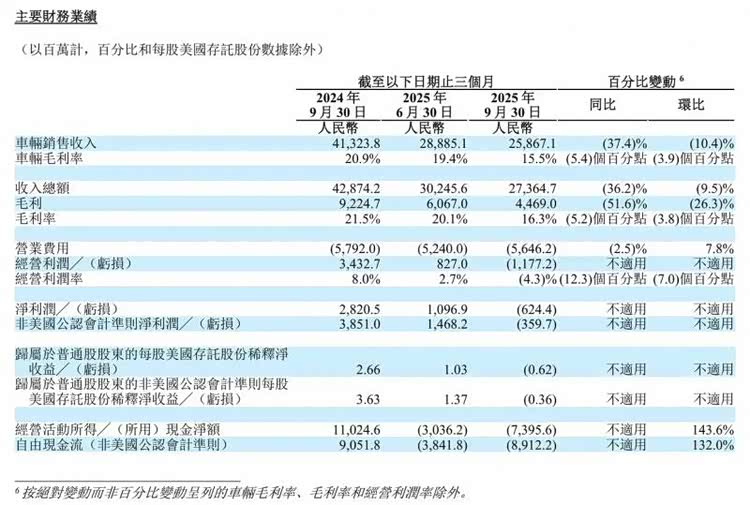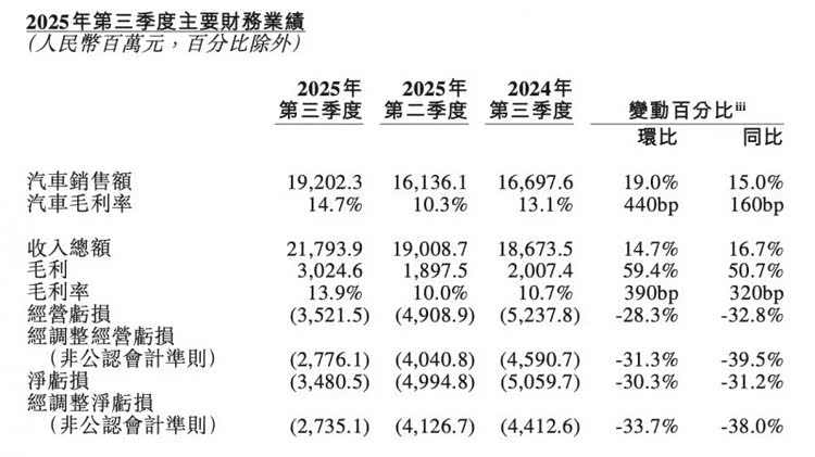 盈利能力指标显现更大分化。蔚来三季度净亏损34.8亿元,但同比收窄31.2%,环比收窄30.3%。整车毛利率升至14.7%,为近三年最高点。