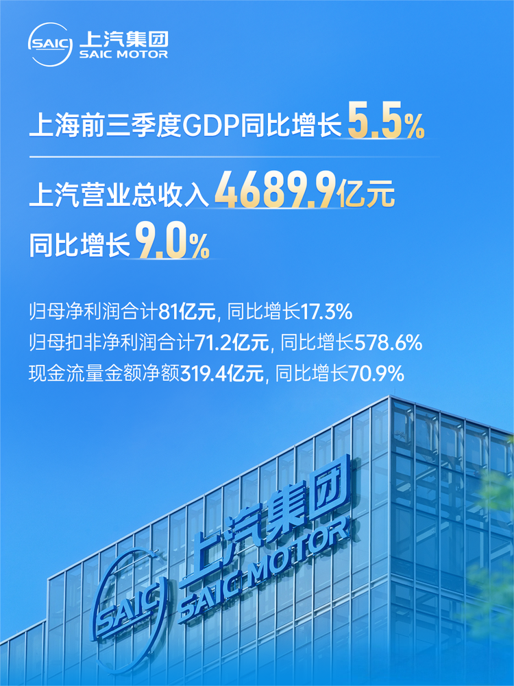 今年上汽集团第三季度财报显示,上汽前三季度整车批售量319.3万辆,同比增长20.5%;营收4689.9亿元,同比增长9%;归母净利润81亿元,同比增长17.3%。其中,三季度整车批售114.1万辆,同比增长38.7%;营收1694亿元,同比增长16.2%;归母净利润20.8亿元,同比增长644.9%。
