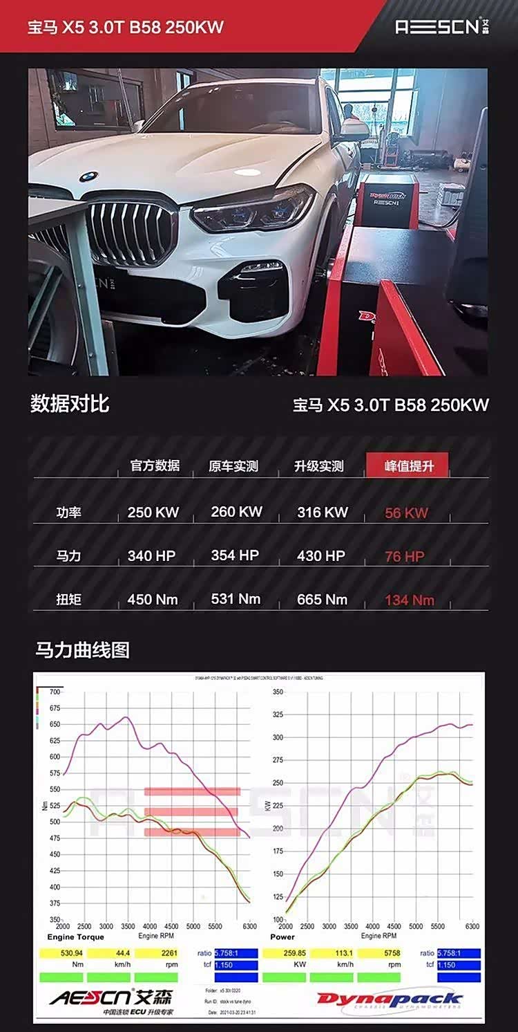 这台宝马X5 xDrive40i配备了型号为B58的3.0T直列六缸发动机,其功率参数达到250kW(340PS),在5500-6500rpm之间可输出最大扭矩450N·m,性能表现与竞争对手相当。其搭载的变速箱是宝马家族广泛使用的来自ZF的8AT,整体表现优秀。对于以运动性能为主的车型,充足的动力储备至关重要,即使日常驾驶可能无需用到极限,但在需要时必须有足够的动力响应。为了在国内实现最佳的动力与操控性能,定制刷写ecu是一个值得考虑的选择。它能确保车辆在安全范围内发挥出最大的性能潜力。