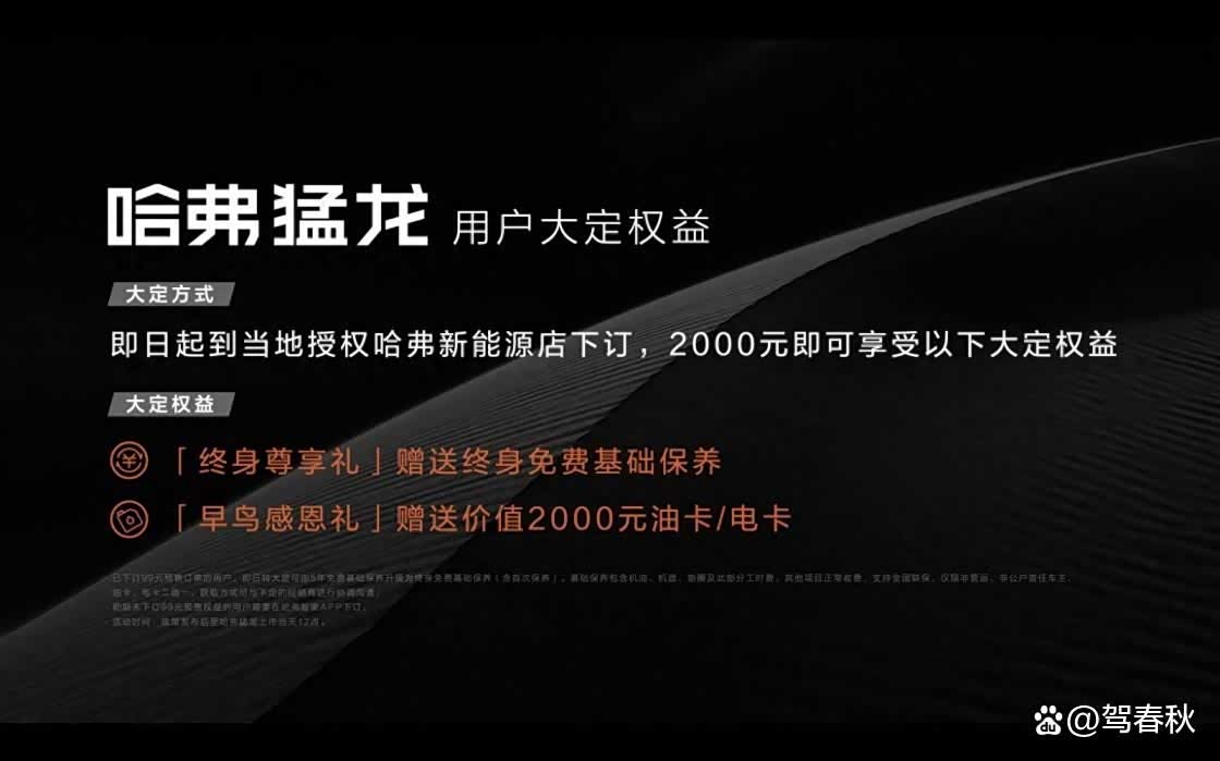 哈弗猛龙很清楚自己的受众群体是年轻人,所以无论是预售价格还是预售权益,它都给的比较实在。据了解,现阶段,哈弗猛龙可享受2000元即可获赠终身免费基础保养和2000元油卡/电卡二选一的权益。这样看来,到底值不值得消费者是一眼就能看得出的。