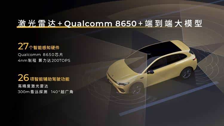 智能驾驶方面,高配的零跑Lafa5会搭载包括激光雷达在内的27个高精度感知硬件以及高通8650芯片,支持端到端辅助驾驶(目前支持高速路段的辅助驾驶,未来将通过OTA实现城区领航辅助)。