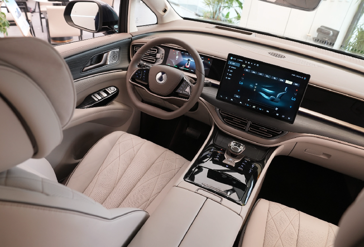 腾势 D9 的内饰堪称 “屏幕盛宴”,10.25 英寸全液晶仪表 + 15.6 英寸悬浮中控屏 + 10.25 英寸副驾屏,再加上 12.8 英寸双头枕屏、5.2 英寸冰箱智能屏等,组成了同级独有的 10 屏互联系统,任意屏幕可联动共享,后排乘客也能独立控制空调、娱乐功能,科技感直接拉满。硬件上搭载专属定制 6nm 芯片,配合 DiLink 智能交互系统,六区域语音唤醒 “可见即可控”,反应速度堪比高端手机,带娃出行时,后排喊一声就能调空调,不用麻烦司机。用料方面,高定奢享绒面顶棚 + 云影天光真木饰板,触感细腻,甲醛含量远低于国标,健康环保。