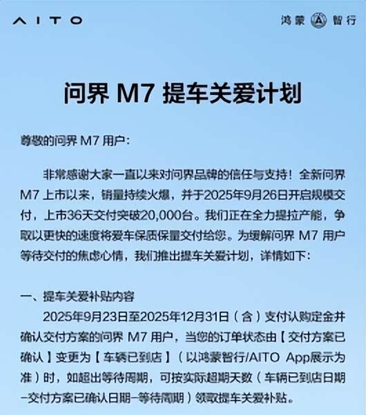更让人感受到品牌温度的是其用户关怀举措。面对持续火爆的订单情况,问界同步推出"提车关爱计划",在2025年9月23日至2025年12月31日(含当日)期间支付认购定金并确认交付方案的用户。当用户在鸿蒙智行APP或AITO APP上的订单状态由“交付方案已确认”变更为“车辆已到店”时,若实际等待天数超过70个自然日(10周),可按超期天数领取每日200元的补贴,至高补贴10000元。同时,品牌还前瞻性地为可能出现的政策变化提供保障,真正做到想用户所想,急用户所急。针对2026年新能源汽车购置税政策调整可能带来的影响,问界还推出跨年购置税补贴方案:在2025年11月3日24:00前完成大定锁单、但因非用户原因导致开票和交付实际发生在2026年的用户,可享至高15000元补贴,通过购车尾款减免或现金方式兑现。