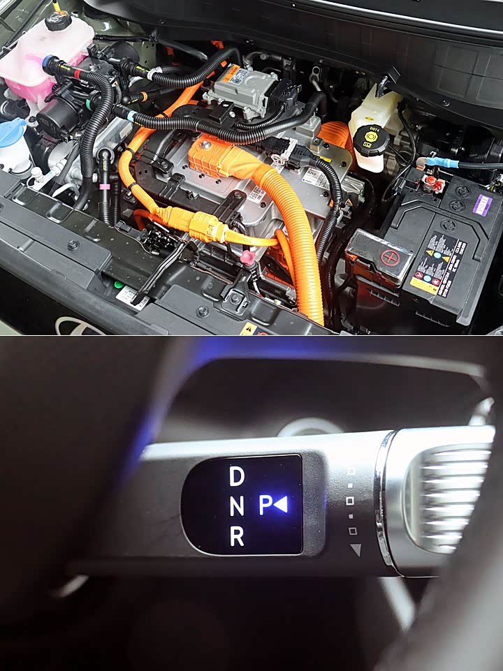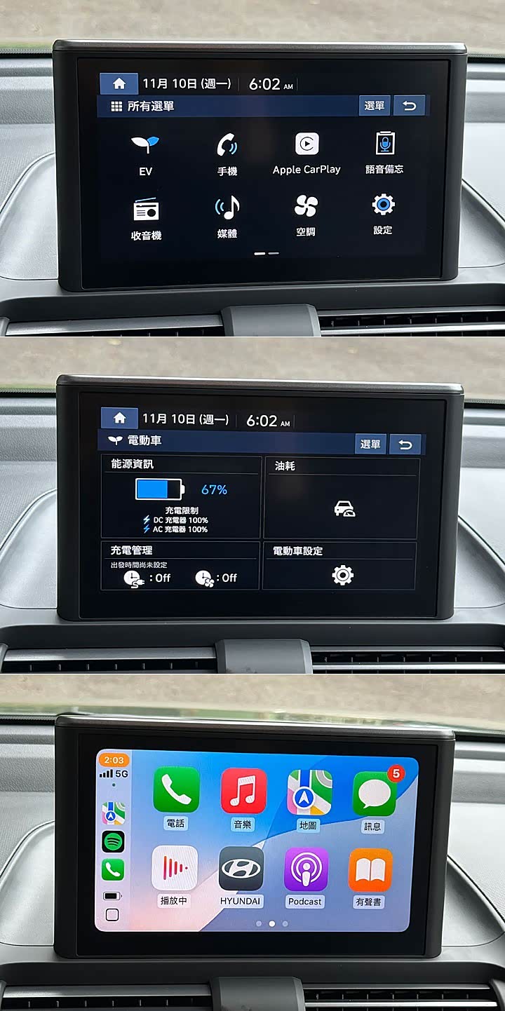 而采全中文显示界面的中央 8 吋触控荧幕,则具备了无线 Apple CarPlay 以及无线 Android Auto 手机连接功能,另外也拥有空调显示面板以及纯电车型专属的能源信息、充电管理、电耗以及电动车设定,不过空调仅提供显示功能,实际操作仍得藉由下方的恒温空调控制面板,另外还提供了独特的宁静模式设定,可让媒体或收音机的拨放仅限定在前座位置。至于在中阶以上车型标配的 V2L 车内供电系统,插头位置则是设定在中控台下方,须将前座椅稍微向后调整,才能较为方便使用。