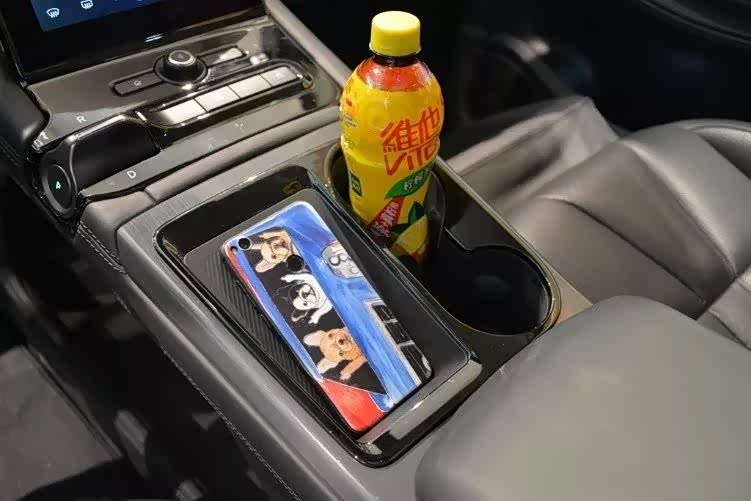 后方的手机槽支持无限充电功能,旁边的杯架内环绕了橡胶垫块,咖哥的饮料瓶放在里边四平八稳。