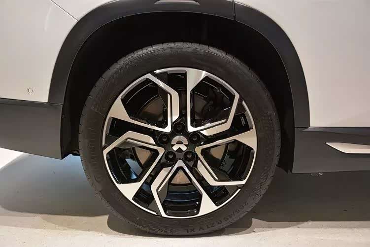 蔚来ES8的轮毂采用了造型凌厉的21寸双色铝合金轮毂,轮胎尺寸前后均为265/45 R21,轮胎则是兼顾操控与舒适性的马牌Max Contact MC6。