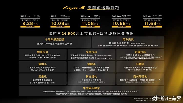 新车发布515km及605km两种续航版本共计5款车型,并推出限时5000元上市感恩现金优惠,即日起至2025年12月31日24点,零跑Lafa5上市限时惊喜价9.28-11.68万元,以极其诚意的定价与品价比,重新定义10万级纯电轿跑市场价值新标准。