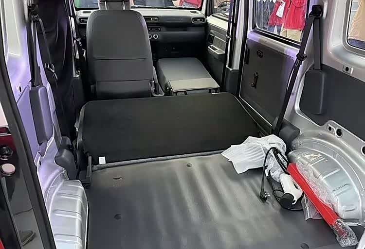 关于空间布局,这款新车采用2+2的四座设计,相较于五菱宏光MINIEV,腿部空间更为宽敞。同时,后备箱空间也表现出色,进一步凸显了其作为“工具车”的特点。值得一提的是,前后座椅可轻松放倒,与后备箱地面齐平,实现出色的装载效果。
