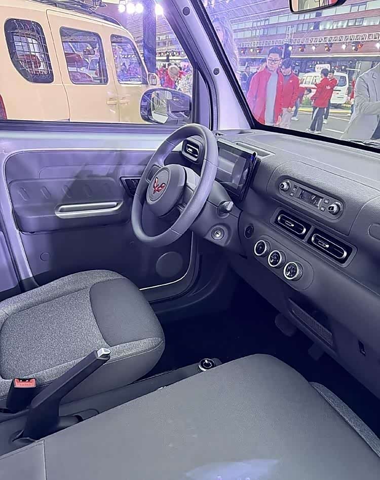 这款新车的内饰设计给人以极简印象。其中控台几乎全由硬塑料打造,配备传统的圆形方向盘,收音机置于空调出风口之上。尽管仪表盘配备齐全,但并未配置中控屏幕。独特的机械式手刹引人注目,其整体设计与配置让人联想到五菱品牌的“面包车”。这款车注重实用性,过多的华丽设计并不突出。若五菱宏光MINIEV的潜在消费群体包含女性,那么她们可能并不喜欢这款车型。