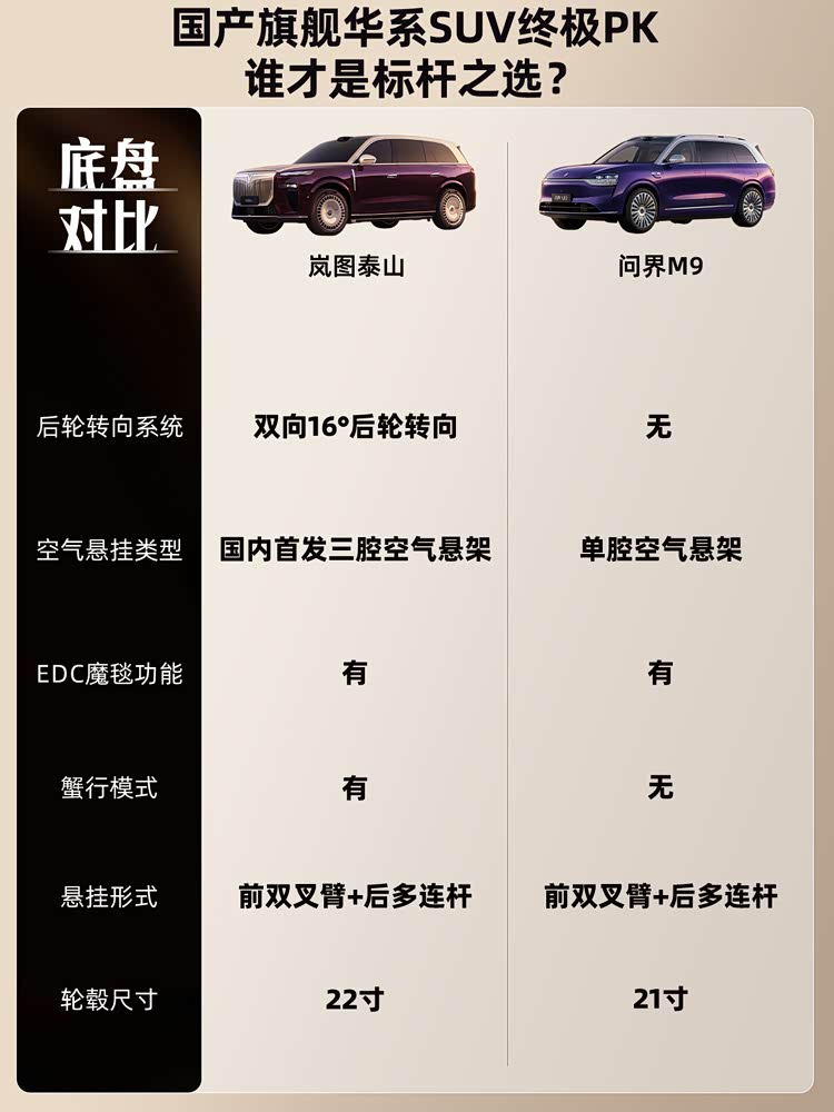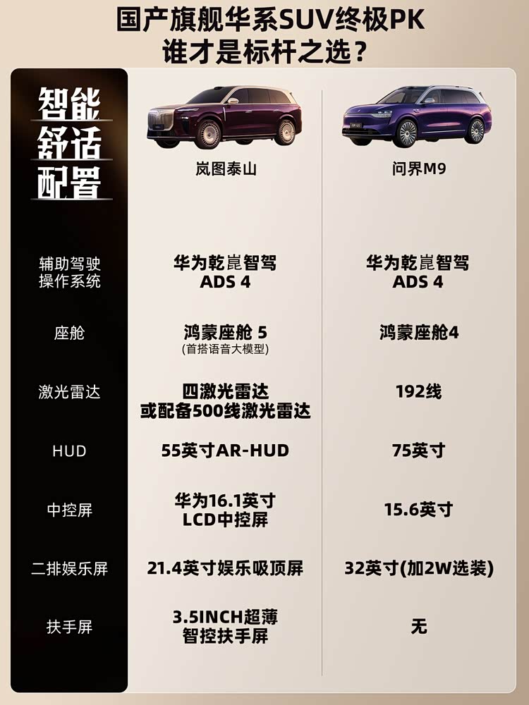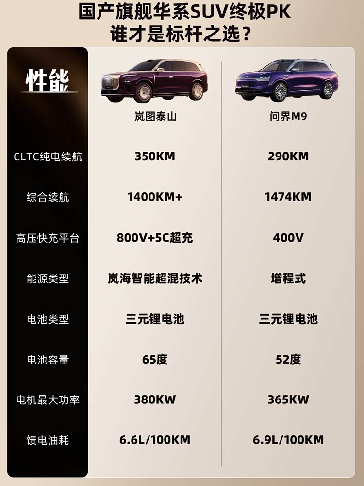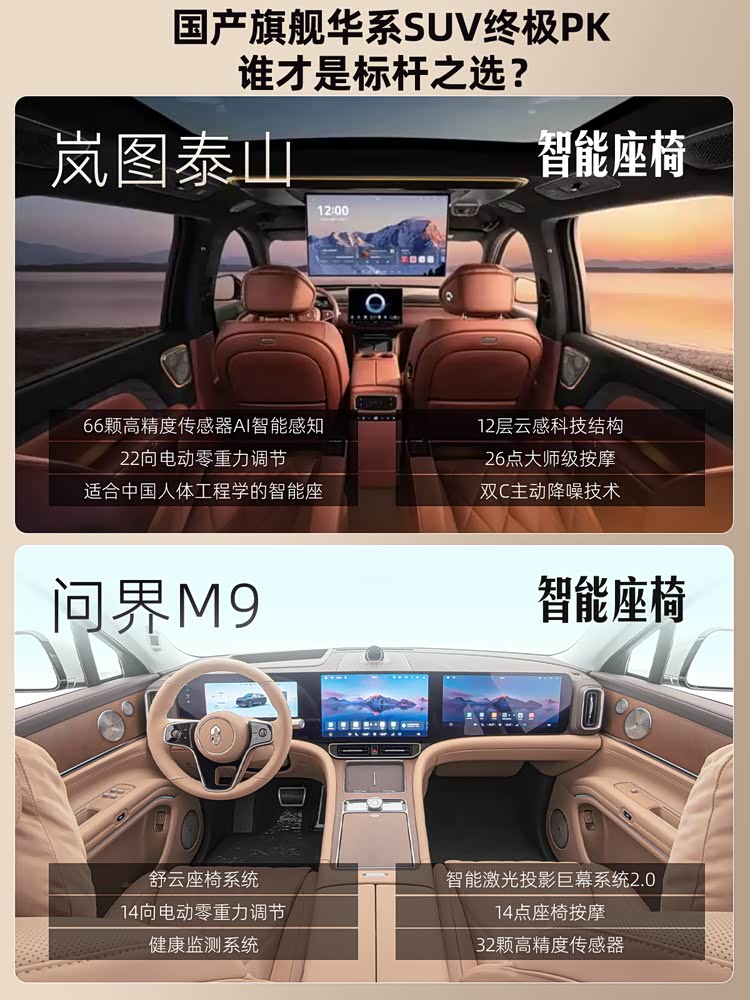 泰山作为旗舰车型,配置够高,用料豪华且更扎实,三电性能强悍,你们觉得这款车怎么样?评论区聊聊!而问界M9同样也是旗舰车型,也足够豪华,三电同样没问题,市场占有率更高但是价格也稍贵一些。所以泰山和问界M9同样作为华系顶奢车型,如果你们准备买大六座旗舰SUV,这两款车,你们会怎么选呢?