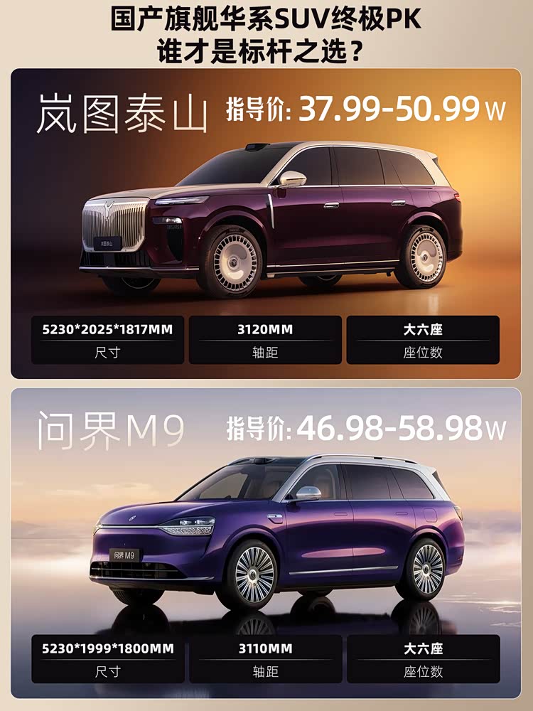 9系年年有,今年特别多。岚图也推出旗舰SUV- 岚图泰山(参数|询价)。指导价37.99-50.99万,你们说这个价格有没有诚意?今天咱们拿卖的比较好的问界M9做个标杆,同样都是华为赋能,横向对比一下,看看泰山和问界到底有什么差异?