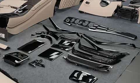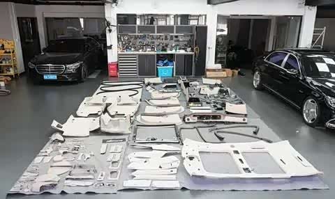仪表台、四门饰板、方向盘、安全气囊、前后中央扶手、座椅皮套、腿托板及其皮垫、脚托、手套箱、转向柱饰板、转向柱外皮套、后视镜、仪表台侧边塑料板、全车桃木饰板、前排座椅靠背与侧面塑料板、顶棚、ABCD柱安全气囊标志盖、遮阳板、天窗卷帘、四门塑料筐饰条以及四门塑胶条等。除此之外,如B柱空调出风口、顶棚化妆镜、安全带、地毯及其通风口饰板等细小配件也需要加工。虽然有些小配件没有一一列出,但整体来说,加工内容相当繁琐且丰富。此次内饰大翻新改造,我们将彻底解决W222车型长时间使用后内饰产生的异味问题,几乎要将内饰全部拆空重新打造。