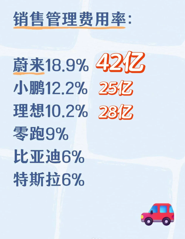 蔚来又因 “高成本” 引发热议!2025 年前三季度,蔚来销售管理费用高达 42 亿元,费用率 18.9%,远超小鹏(12.2%)、理想(10.2%),更是比亚迪、特斯拉(均为 6%)的 3 倍多。这一悬殊数据让网友疑惑:“钱到底花在哪了?” 深入拆解后发现,这笔高额费用的背后,是蔚来 “豪华服务 + 用户运营” 的独特模式,也是其在新能源市场差异化竞争的核心逻辑。