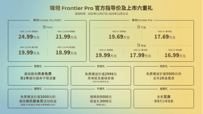 锋坦Frontier Pro共推出汽油、柴油、PHEV三种动力共计9款车型,售价区间为16.99-24.99万元,其中锋坦Frontier Pro售价16.99-19.69万元,锋坦Frontier Pro PHEV售价18.99-24.99万元。