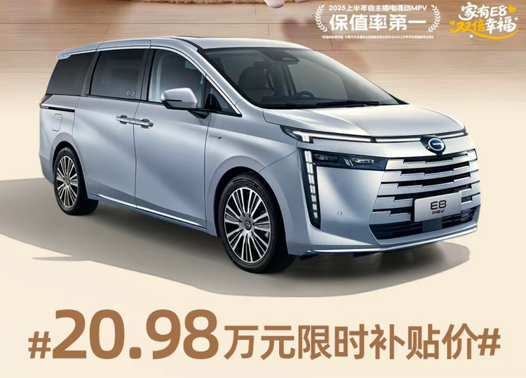 传祺E8 全运版在11月10日上市,限时补贴价20.98万,新车限量发售419辆,这款车外内饰设计和标准版保持一致,车机配备ADiGO 5.0系统,拥有骁龙8155芯片加持,还配备有座椅零重力模式、二排小桌板、电动腿托等,限时赠送17.3英寸二排吸顶屏+铝地板,匹配的是2.0L插混系统,纯电续航150km。