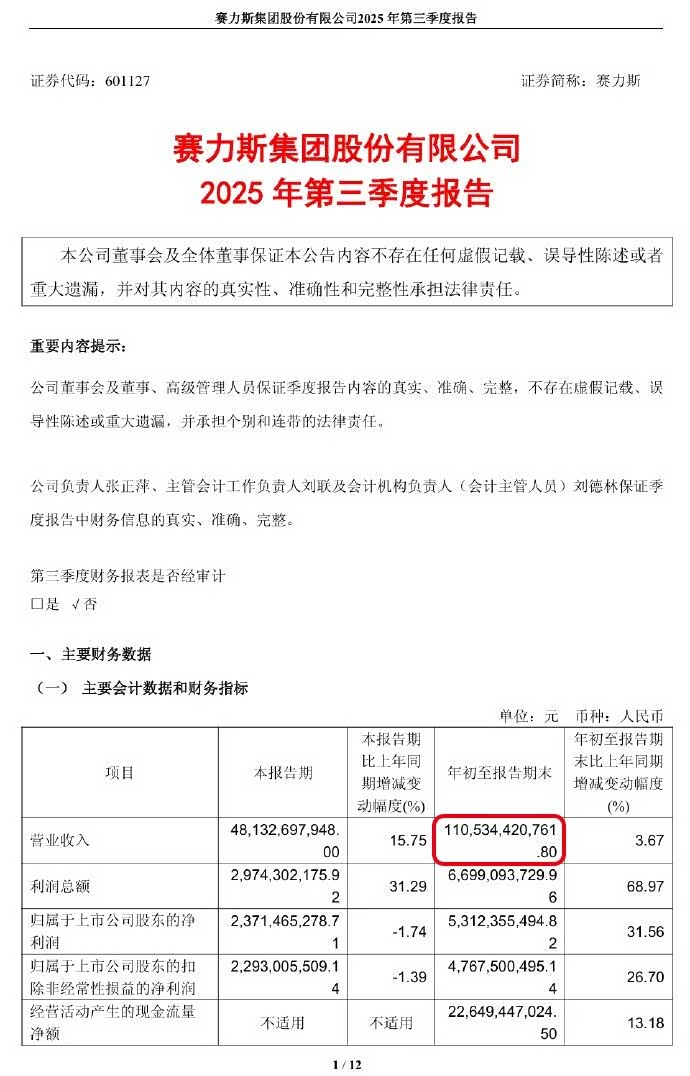 问界母公司赛力斯今年前三季度实现营收1105.34亿元,同比增长3.67%,归属于上市公司股东的净利润53.12亿元,同比增长31.56%。11月5日,赛力斯登陆港交所主板,成为国内首家“A+H”两地上市的豪华新能源车企。