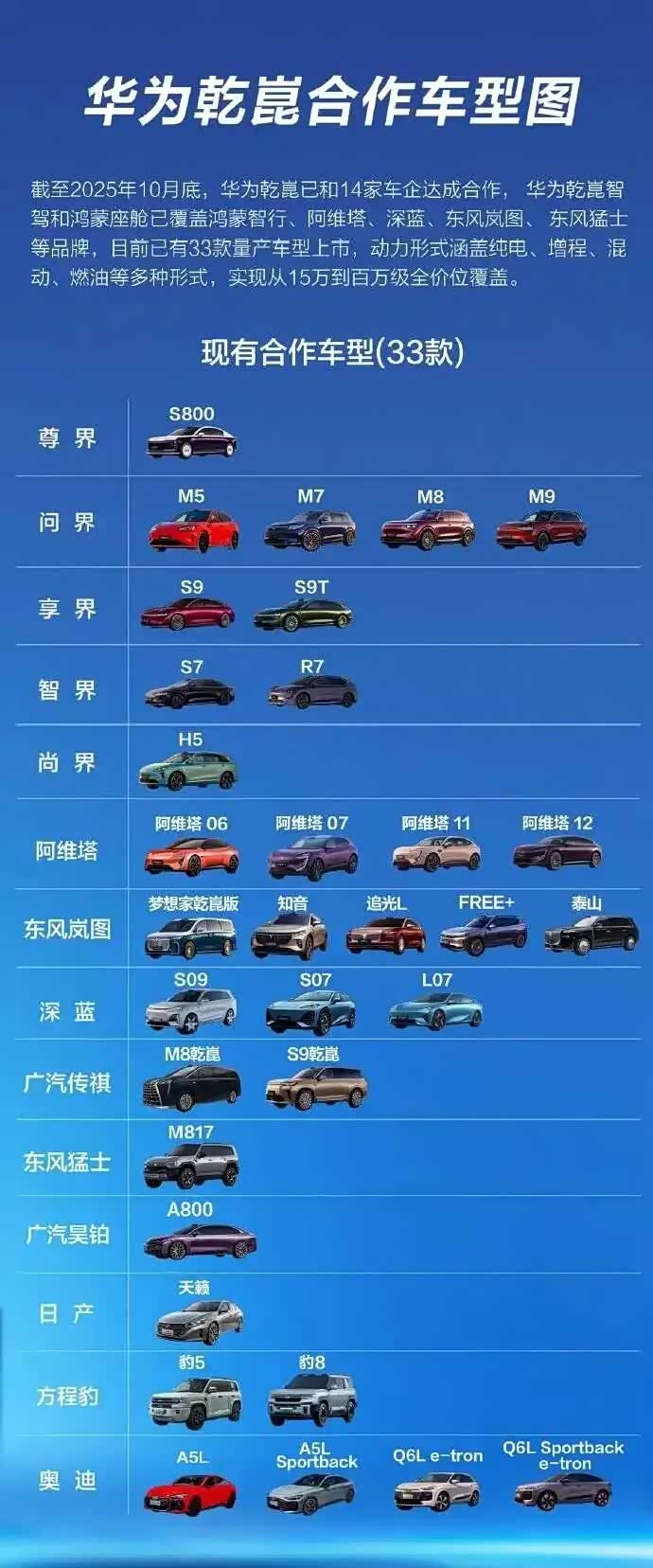 这股“华为风”的兴起并非毫无预兆。据第三方不完全数据统计,目前搭载华为乾崑智驾的合作车型已达33款,覆盖问界、智界、阿维塔、奥迪、广汽昊铂等14家车企。
