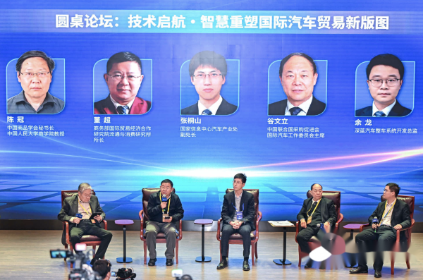 随后,在圆桌论坛环节,中国商品学会会长、人大商学院教授陈冠作为主持人,商务部国际贸易经济合作研究院流通与消费研究所所长董超、国家信息中心汽车产业处副处长张桐山、中国联合国采购促进会国际汽车工作委员会主席谷文立、深蓝汽车整车系统开发总监余龙作为对话嘉宾,从政策、市场、技术、企业战略等角度进行了深入讨论。