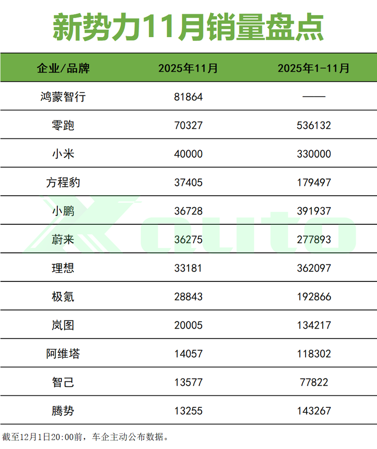 12月1日,部分品牌抢先公布2025年11月数据,截至发稿前,已有12家企业/品牌发布销量数据。