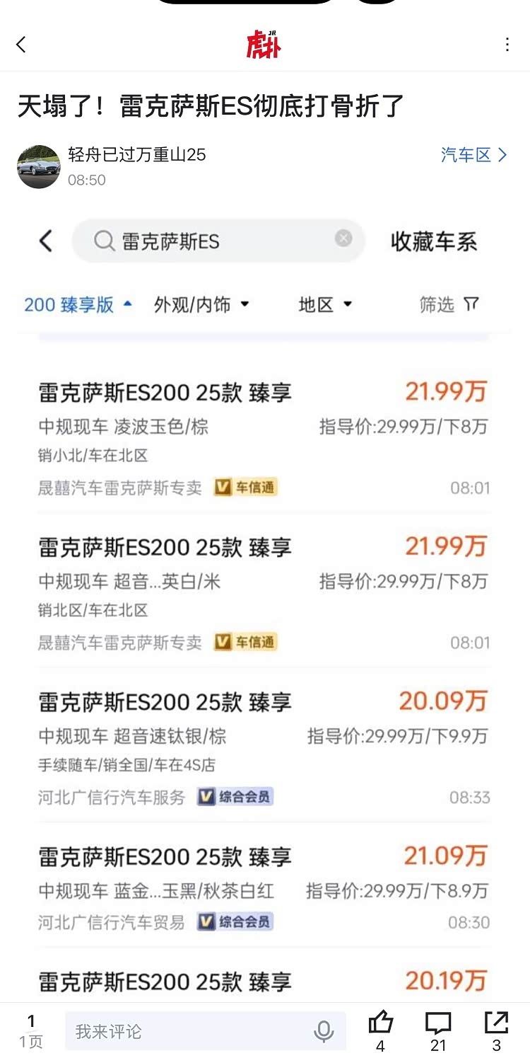 最近,有媒体爆料,雷克萨斯ES出现大幅打折,原本指导价29.99万的ES200,优惠8万,裸车价变成21.99万。甚至有部分门店直接降价10万元,裸车价下调至20.09万。