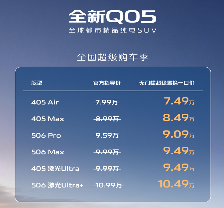 车家号·0浏览·2025-12-02 00:01 · 北京长安启源Q05上市售价区间为7.99万-10.99万元,优惠5000元后,起售价来到了7.49万元!定位为紧凑级SUV,CLTC工况续航里程有405公里和506公里可选。