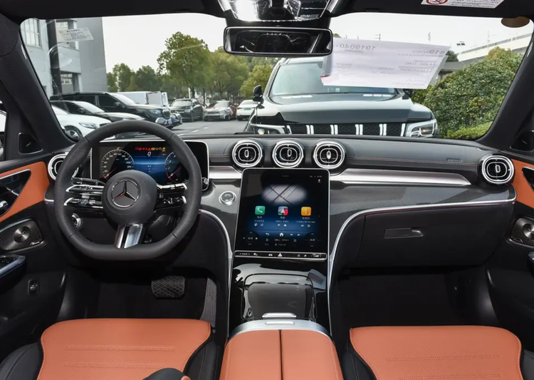 来到内饰,奔驰C级内饰营造出的豪华感以及质感都是能够讨好年轻人的,难怪选择奔驰C级的车主都以00为主。可以看到中控台上采用皮革包裹加红色缝线工艺,下方是亮色饰板搭配镀铬条装饰,中控浮岛和车门细节都用烤漆饰板。我很喜欢奔驰C级的方向盘,皮革包裹带打孔工艺,而且很大手感很好。12.3英寸的液晶仪表采用悬浮式设计,中控屏为11.9英寸并向驾驶员倾斜6°,这个角度刚好避免阳光直射导致干扰视线,又让驾驶员缩短百分15的操作距离,增强体验度。座椅也是双拼色并带打孔功能,支持多向电动调节。梅赛德斯-奔驰C级配备了第三代MBUX系统和高通骁龙8295芯片,AI算力能达到30TOPS。结合降噪功能,可以把语音唤醒时间控制在0.8秒内。