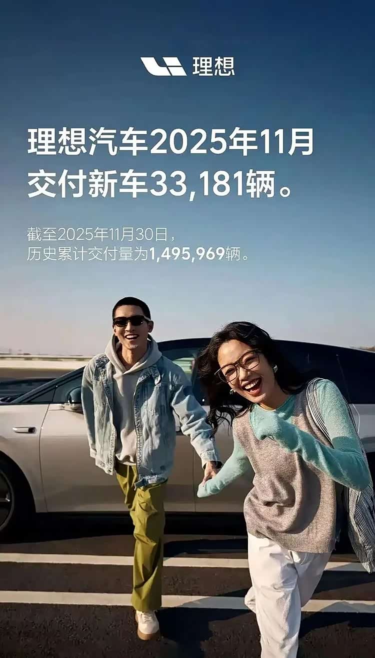 12月1日,理想汽车公布2025年11月交付数据。2025年11月,理想汽车交付新车33181辆,相比去年同期销量48740辆,同比下滑31.92%.