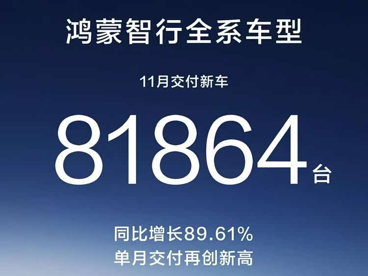 整个2025年11月,鸿蒙智行全新交付新车81864台,同比增长89.61%,单月交付量再创新高。问界M8上市200天,累计交付突破12万台,成为问界品牌年度最大爆款车。