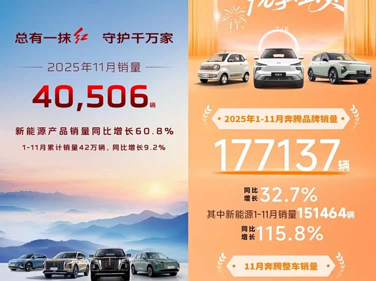 中国一汽11月销售整车30.6万辆。自主品牌销量8.5万辆;自主新能源汽车销量3.55万辆。其中,红旗品牌单月销量40506辆,奔腾品牌销量达19520辆,同比增长15.4%。