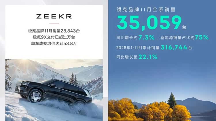 吉利汽车集团交出了漂亮的成绩单。11月,单月乘用车销量达31.04万辆,同比增长24%,不仅创下历史新高,更实现连续9个月同环比双增长。今年前11个月,吉利累计销量278.78万辆,同比增长42%,全年300万辆销量目标达成率已达93%。
