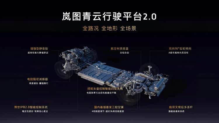 整车基于800V岚海智能超混平台打造,采用1.5T插混方案,CLTC工况下有着370km的纯电续航与1400km的综合续航。整车支持5C超充技术,可在12分钟内完成80%的电量补充,充电10分钟即可增加450km续航。整车底盘部分采用双叉臂+多连杆的全铝结构,并配备三腔空气悬架与CDC可变阻尼减振器,兼顾了操控精准性与乘坐舒适性。
