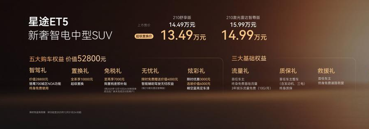 11月28日,星途汽车在珠海正式公布全新“新奢智电中型SUV”——星途ET5。新车共推出210舒享版、210激光雷达智尊版两款配置,官方指导价14.49万元—15.99万元,并同步提供超级置换价13.49万元—14.99万元。发布会现场还宣布猎鹰700城区NOA终身免费使用,将智驾体验真正做到“用得起,用得好”。