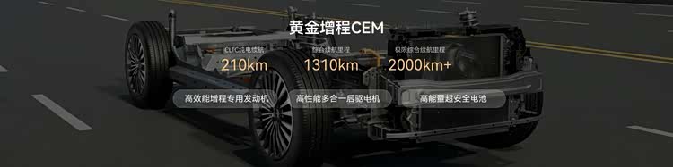 动力系统方面,新车搭载“黄金增程CEM系统”,以同级唯一1.5T增程器为核心,拥有45.79%热效率、3.71kWh/L油电转化效率。在CLTC标准下纯电续航为210km,可覆盖大部分日常通勤场景;极限综合续航2000km+,具备跨省、跨区域出行能力。