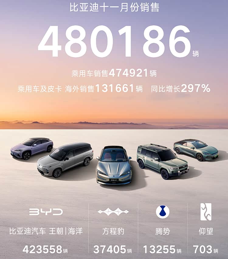 根据比亚迪公开的销售数据显示,在刚刚过去的11月份,比亚迪单月销量达到了480186台,创下了年内单月销量新高度,其中,乘用车及皮卡海外销售131661台,同比增长297%,创下历史新高。2025年1-11月比亚迪累计销量4182038台,其中,海外出口916764台。