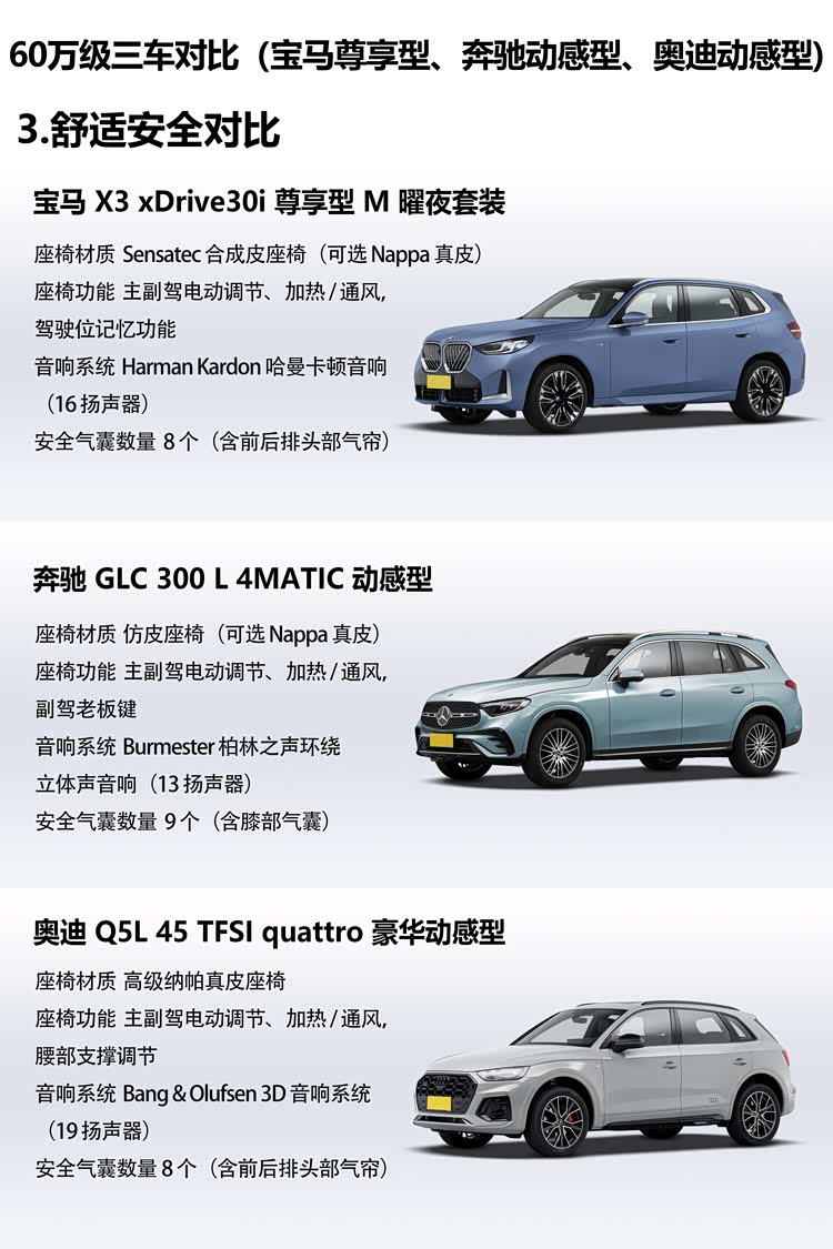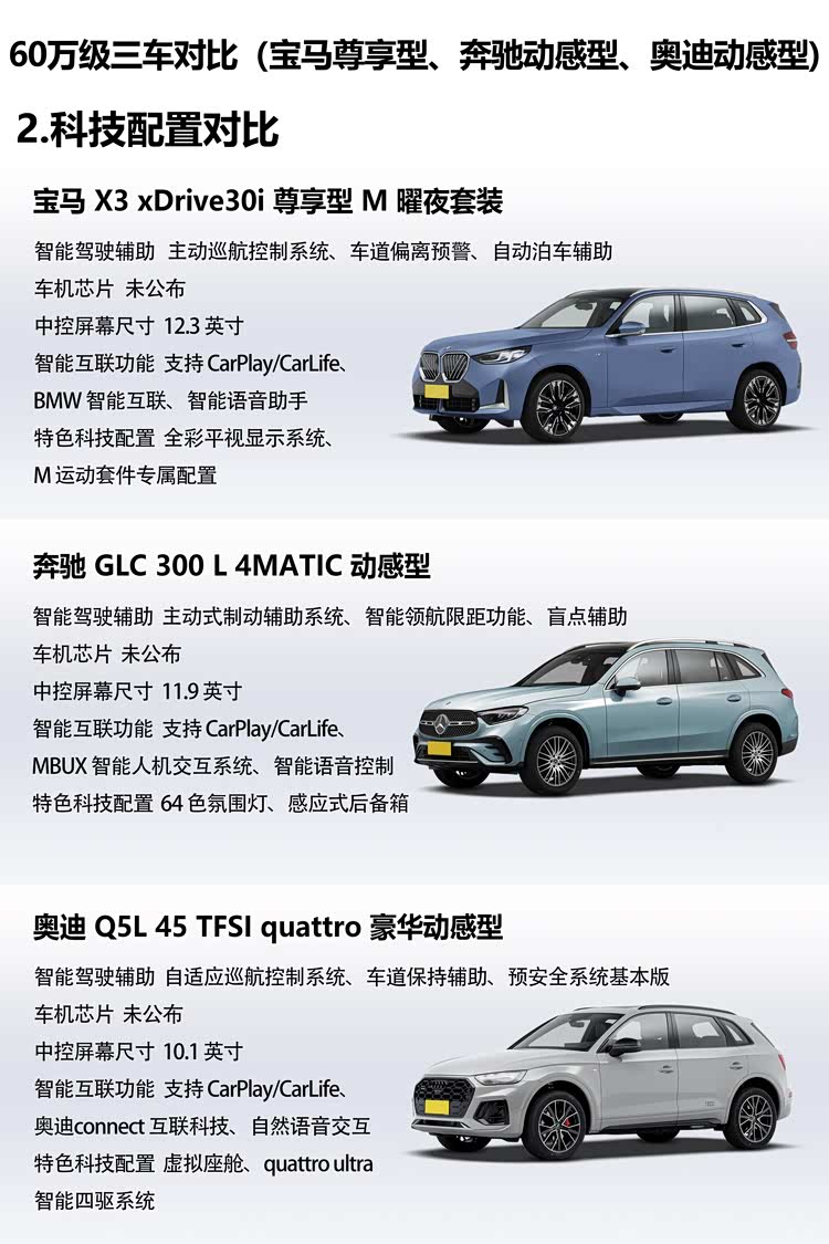 追求纯粹驾驶乐趣和运动配置选宝马 X3;看重豪华氛围和科技配置选 奔驰 GLC(参数|询价);想要智能四驱和虚拟座舱体验选奥迪 Q5L 。