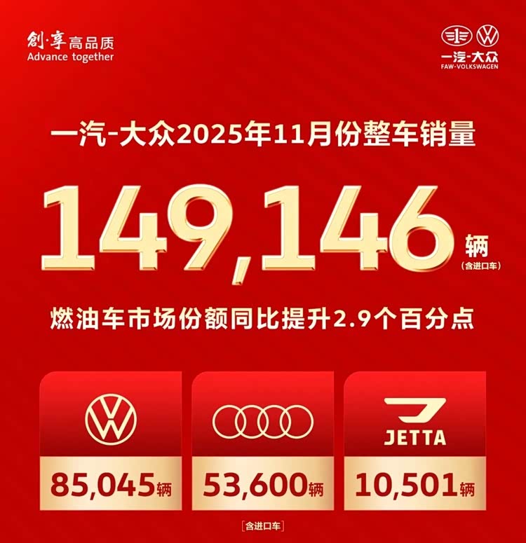 日前,一汽-大众公布了最新的销量“成绩单”。据官方数据显示,一汽-大众11月销量达到149146辆(含进口车)。其中,一汽-大众旗下三大品牌燃油车市场份额均实现同比正增长,整体同比提升了2.9个百分点。