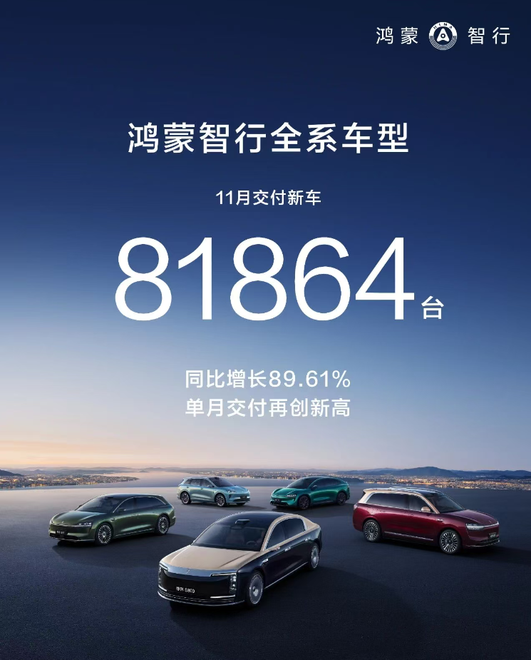 鸿蒙智行官宣11月份交付新车81864辆,同比增长89.61%,当月交付再创历史新高。与10月份交付68216辆新车相比,环比增长也是非常可观。鸿蒙智行并没有公布具体车型的销量,但赛力斯的公告表明11月销量55203辆,同比增长49.84%,而10月份的销量为51456辆,尚界官方发布的信息则表明, 尚界H5(参数|询价)在11月的交付量突破了10000辆,把各方数据一汇总,果然是问界和尚界支持了鸿蒙智行11月份交付量的大幅增长。