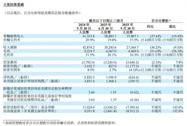 财报里的核心数据更是看得人揪心,三季度理想总共卖了9.3万辆车,比去年同期少了近四成。收入274亿元,同比降了36.2%,相当于少赚了150多亿。细分到卖车业务,收入259亿元,同比下滑37.4%,毛利率也从去年的20.9%跌到15.5%,整体毛利率从21.5%降到16.3%。